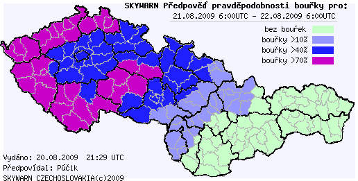 Silné bouřky zasáhnou převážně západní a severozápadní Čechy. Nelze vyloučit i její vývoj v rámci celých Čech a Vysočiny. Postup bouřek dál na východ bude během noci slábnout a tak na Moravě a ve Slezsku neočekáváme natolik silné bouřky, které mají být zvláště v Čechách.