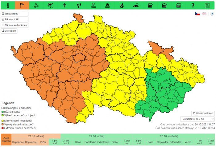 Na dnešní čtvrteční den vydal ČHMÚ výstrahu na silný jihozápadní, postupně západní vítr 8 až 13 m/s, místy s nárazy kolem 25 m/s (90 km/h), na horách 30 až 35 m/s (až 125 km/h). Výstraha je v platnosti až do 20 hodiny.