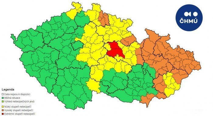 Oranžová barva na mapě znamená: Povodňová pohotovost – 2. stupeň povodňové aktivity v některých říčních profilech. Voda v řekách se může vylévat z břehů do okolní krajiny.