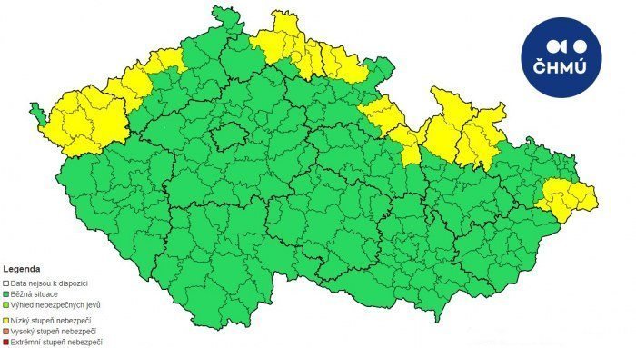 Žlutá barva na mapě znamená: Povodňová bdělost – 1. (nejnižší) stupeň povodňové aktivity v některých říčních profilech.